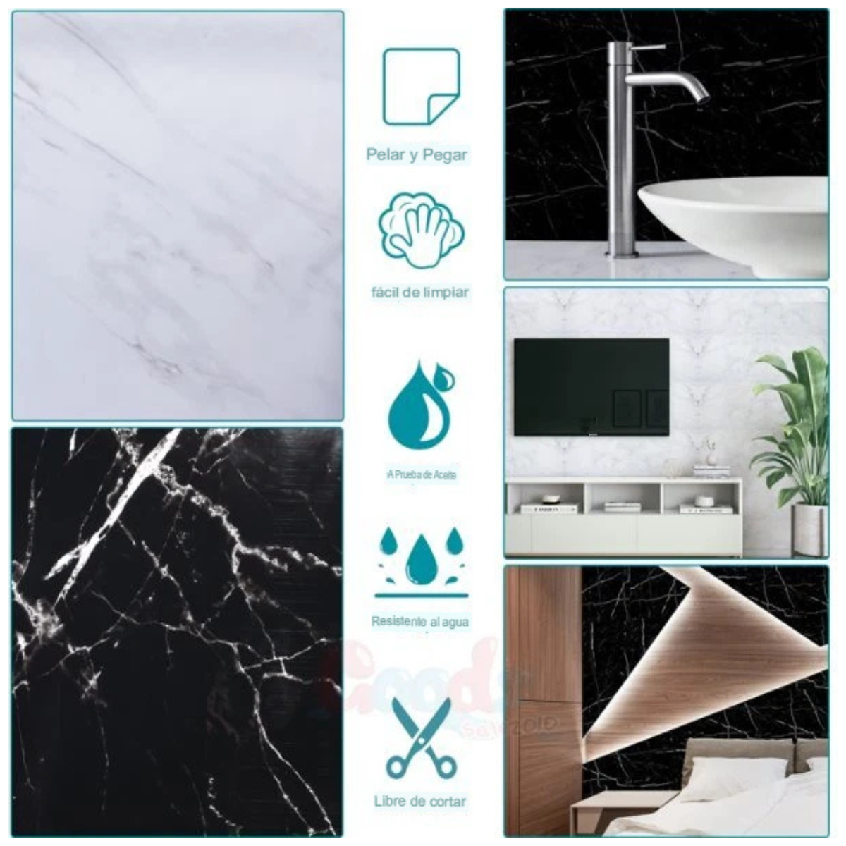 Papel mural de estilo mármol negro, autoadhesivo, lavable e impermeable. Fácil de instalar y perfecto para decorar ambientes modernos en hogares y oficinas. Cada rollo cubre aproximadamente 6 m².