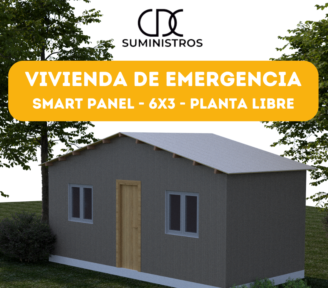 VIVIENDA DE EMERGENCIA SMARTPANEL EXTERIOR OSB STANDAR INTERIOR CAIDA 2 AGUAS 6×3 mts. Con recinto para baño